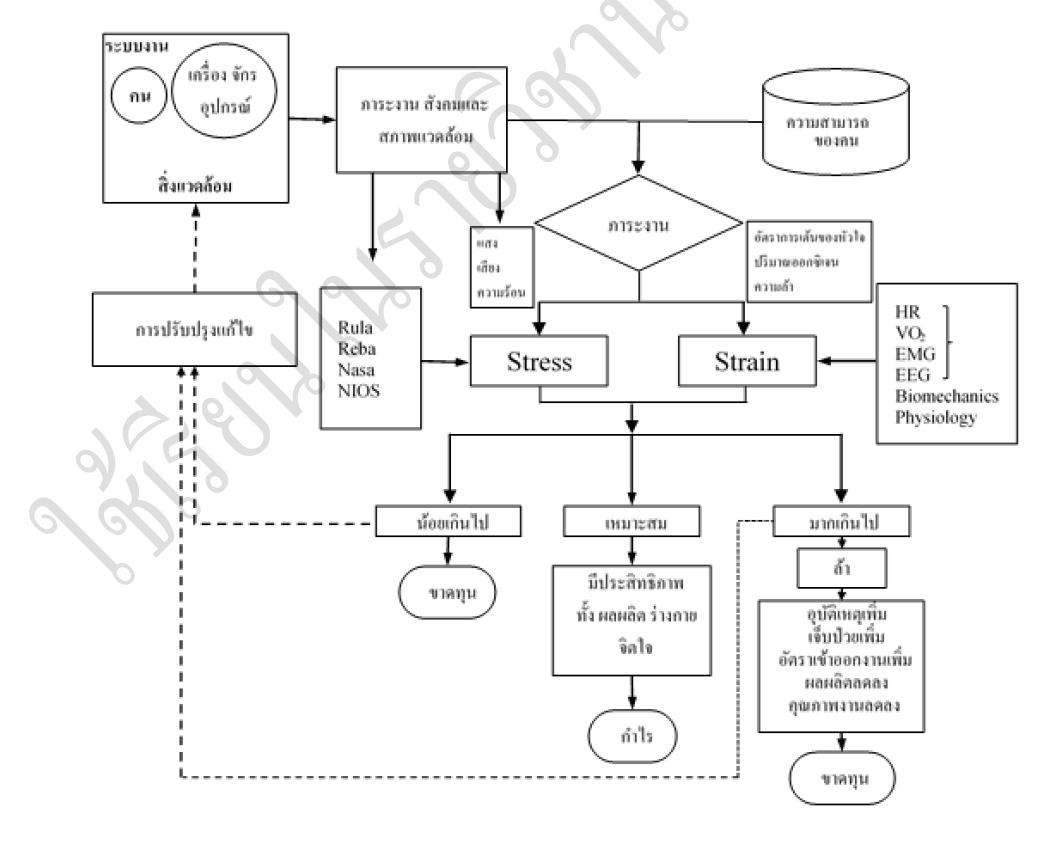 ในระบบงาน เป็นการทำงานร่วมกันของ คน เครื่องจักร อุปกรณ์ ภายใต้สภาพสิ่งแวดล้อมในสถานีงาน ดังนั้นการทำงานของผู้ปฏิบัติงานนั้น จักต้องคำนึงถึงภาระงาน สังคมและสภาพแวดล้อม อีกทั้งยังต้องทราบถึงขีดความสามารถของคนที่เป็นผู้ปฏิบัติงานอีกด้วย หากผู้ปฏิบัติงานได้รับภาระงานที่น้อยเกินไปก็จะทำให้ขาดทุน (ล้มละลาย) แต่หากได้รับภาระงานที่มากเกินไป ผู้ปฏิบัติก็จะเกิดความเมื่อยล้า และจักนำมาซึ่งการเกิดอุบัติเหตุในการทำงาน การเจ็บป่วย ส่งผลให้อัตราการเข้า-ออกงานเพิ่มขึ้น ผลผลิตลดลง คุณภาพงานลดลง และทำให้เกิดการขาดทุนในที่สุด ดังนั้นหากพบว่าภาระงานไม่เหมาะสมก็ควรจะมีการปรับปรุงแก้ไข ระบบงาน คน เครื่องจักร อุปกรณ์ และสิ่งแวดล้อม เพื่อให้เหมาะสมต่อไป ซึ่งความสัมพันธ์ดังที่กล่าวมาข้างต้น ได้อธิบายในรูปที่ 1-1